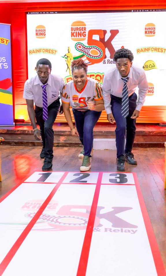 Nadia Kiffen-Green (centre), head of sales and marketing at Burger King; Kingston College’s Stephen Muturi (left); and Jamaica College’s Carlos Brison-Cainez are eager to get the race started during a media launch for the BK 5k and Relay recently.