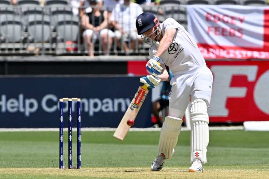 England’s Harry Brook hits a six on the opening day of the first Ashes cricket Test match versus Australia at Perth.