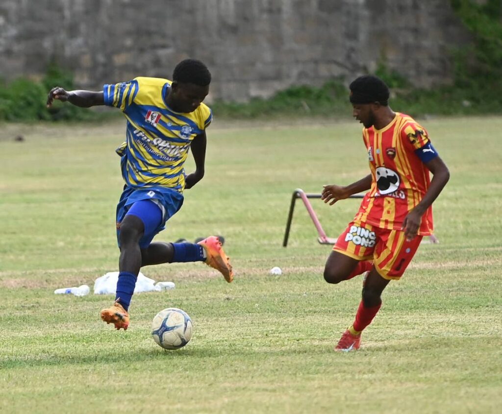 Christiana High’s Danray Cameron (left) tries to get away from Cornwall College’s Deshaun Talbert in their ISSA daCosta Cup Round-of-16 game played in Montego Bay on December 2, 2025. Cornwall College won the game 3-1. (Photo: Paul Reid)