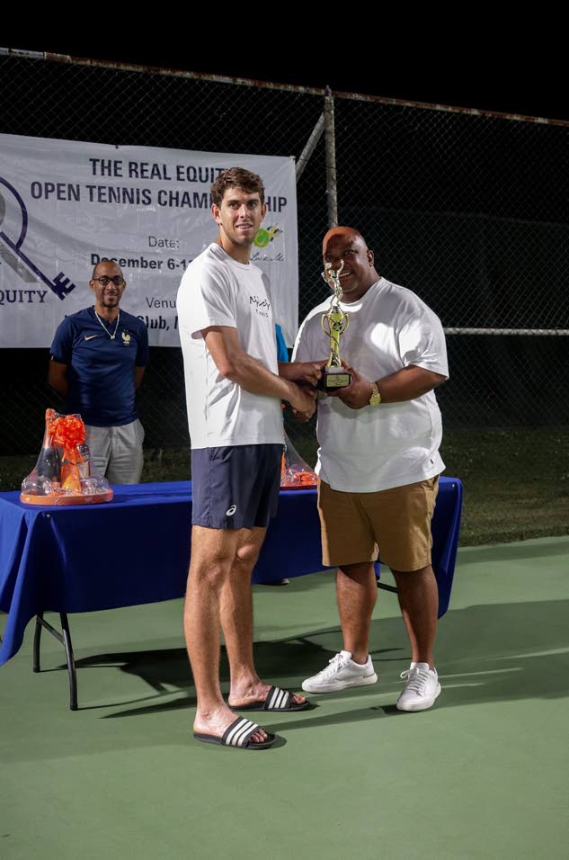 Winner of the Men’s Class 2 category, Ricardo Chambers (left), collects a trophy from Real Equity’s Managing Director Sean Shelton at the Real Equity Open Tennis Championship at Liguanea Club recently.