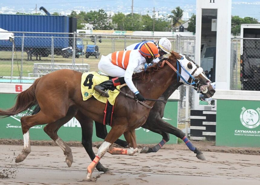 Rock-Ola (#4-Dane McKenzie) gets the better of stablemate Captain Fantastic (partially hidden – Phillip Parchment) in the third race, giving trainer Michael Marlow his 100th career winner at Caymanas Park on Saturday. Karl Mclarty