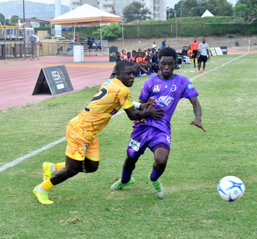 Garvey Maceo High’s Javan Foster (left) and Foga Road High’s Kevaughn Palmer battle for the ball during the ISSA daCosta Cup match at Stadium East on September 6, 2025. (Photo: Karl Mclarty)
