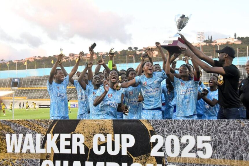 Anthony Patrick, St Catherine High’s football coach, lifts the Walker Cup.