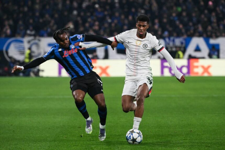Atalanta’s Nigerian forward Ademola Lookman (left) fights for the ball with Chelsea’s English defender #34 Josh-Kofi Acheampong during the UEFA Champions League league phase day 6 football match between Atalanta Bergamo and Chelsea FC at Bergamo Stadium, in Bergamo, on December 9, 2025. (Photo: AFP)