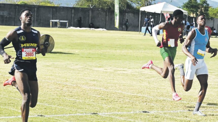 Munro College’s Romario Hines (left) wins the Class One Boys’ 100m during the 2025 staging of the STETHS/ Ollivierre/ Smith Invitational Meet at the STETHS Sports Complex in Santa Cruz, St Elizabeth, on January 25, 2025. Lacovia High’s Rosean Smith (right) finishes second overall while Green Island High’s Romario Johnson is fourth overall. (Photo: Paul Reid)