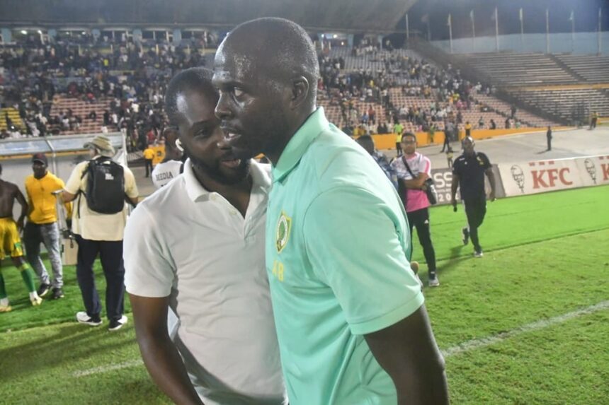 Excelsior High coach Keon Broderick (right) is congratulated by his Jamaica College counterpart Davion Ferguson following the Manning Cup final on Friday, December 19, 2025. Excelsior won the match 2-0. (Photo: Garfield Robinson)