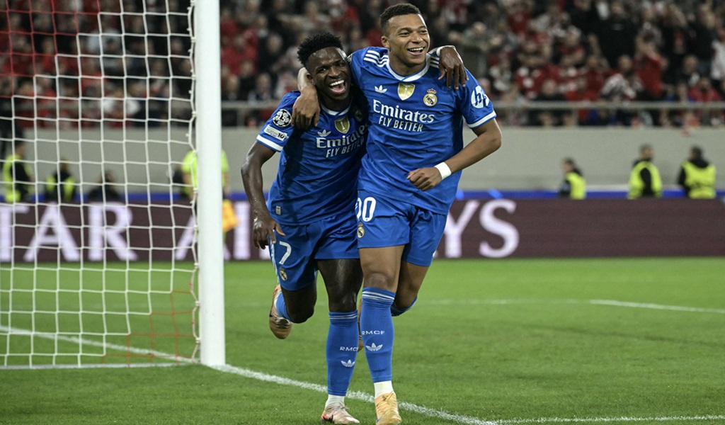 Real Madrid’s French forward #10 Kylian Mbappe (right) celebrates with Real Madrid’s Brazilian forward #07 Vinicius Junior after scoring Real Madrid’s fourth goal during the UEFA Champions League, league phase – matchday 5, football match between Olympiakos (GRE) and Real Madrid (ESP) at the Georgios Karaiskakis Stadium in Piraeus on November 26, 2025. (Photo: AFP)