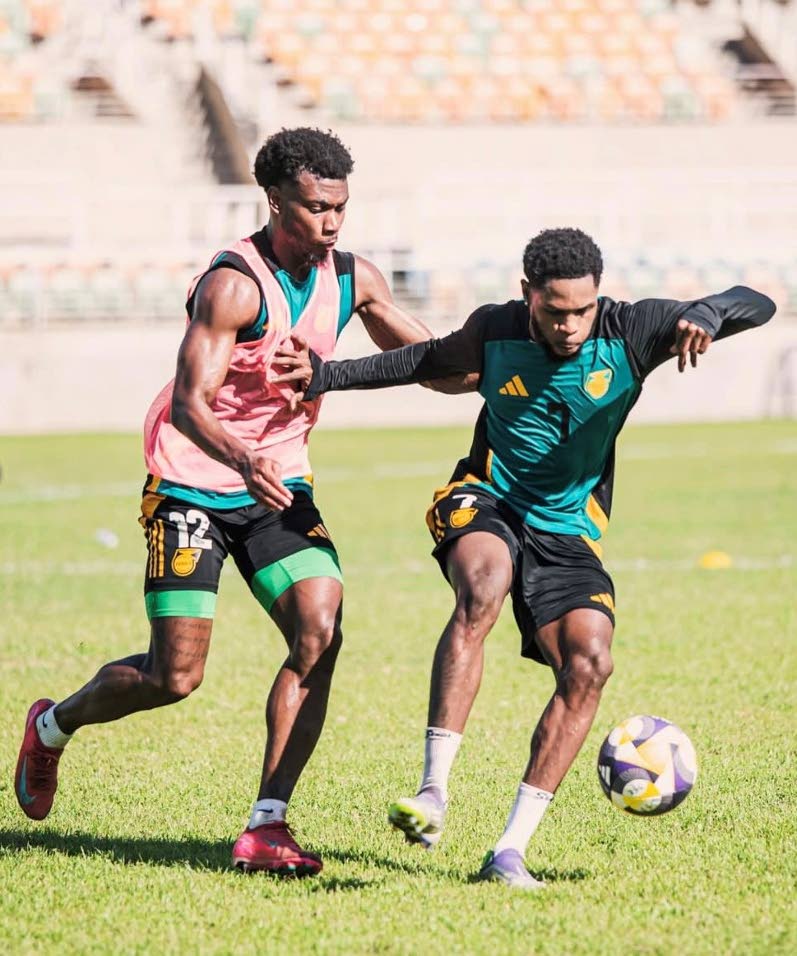 Nico Brown (left) challenges Renaldo Webster during a Jamaica Reggae Boyz training session at Sabina Park in Kingston on Thursday. Photo: JFF