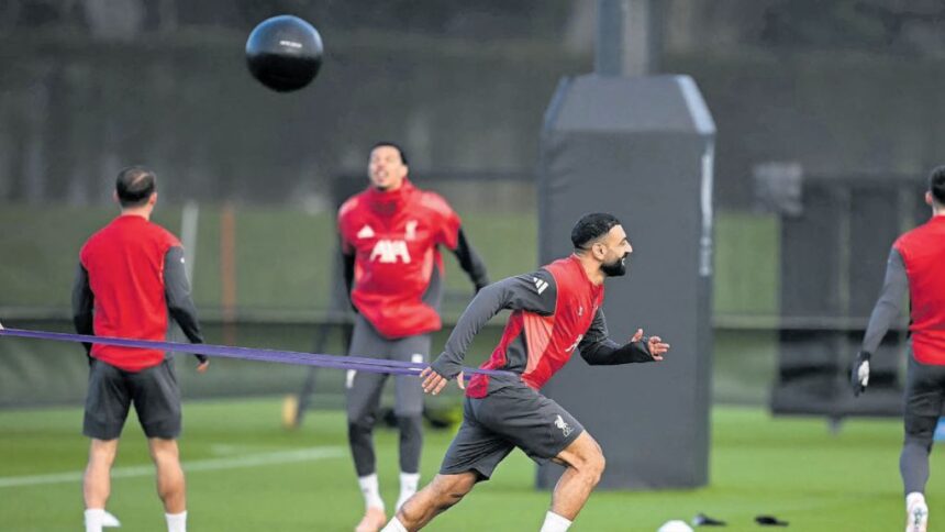 Liverpool’s Mohamed Salah (foreground) trains at their practice ground in Kirkby, Liverpool, north-west England, on December 8, 2025, on the eve of the UEFA Champions League football match away to Inter Milan. (Photo: AFP)