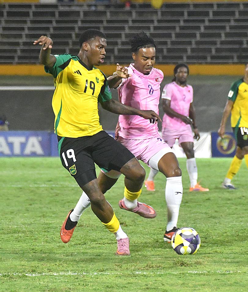Jamaica forward Dujuan Richards (left) is challenged by Bermuda’s Aunde Todd during their FIFA World Cup qualifying match at the National Stadium on Tuesday night. (Photo: Garfield Robinson)