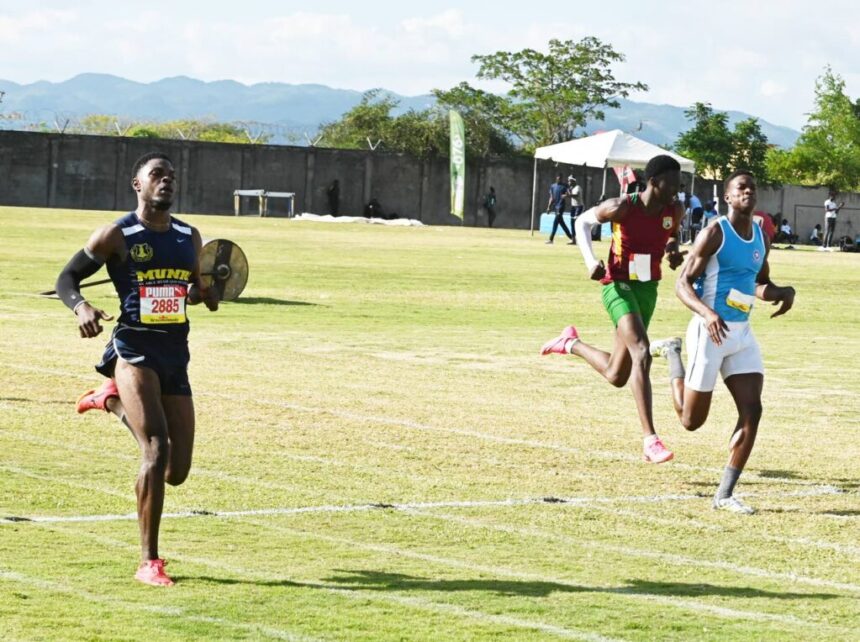 Munro College’s Romario Hines (left) wins the Class One Boys 100m during the 2025 staging of the STETHS/ Ollivierre/ Smith Invitational Meet at STETHS Sports Complex in Santa Cruz. Lacovia High’s Rosean Smith (right) finished second overall, while Green Island High’s Romario Johnson was fourth overall. (Photo: Paul Reid)