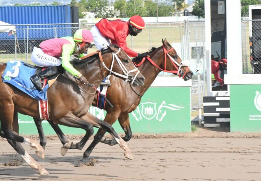 Victorious Links (right-Dane Dawkins) holds off Mo Pai (Tajay Suckoo) to win the fourth race on Saturday, January 3, 2026.(Photo: Karl Mclarty)