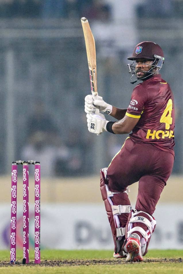West Indies Captain Shai Hope watches the ball after playing a shot during the second One-Day International (ODI) cricket match against Bangladesh at the Sher-e-Bangla National Cricket Stadium in Dhaka, Bangladesh, on Tuesday. (Photo: AFP)